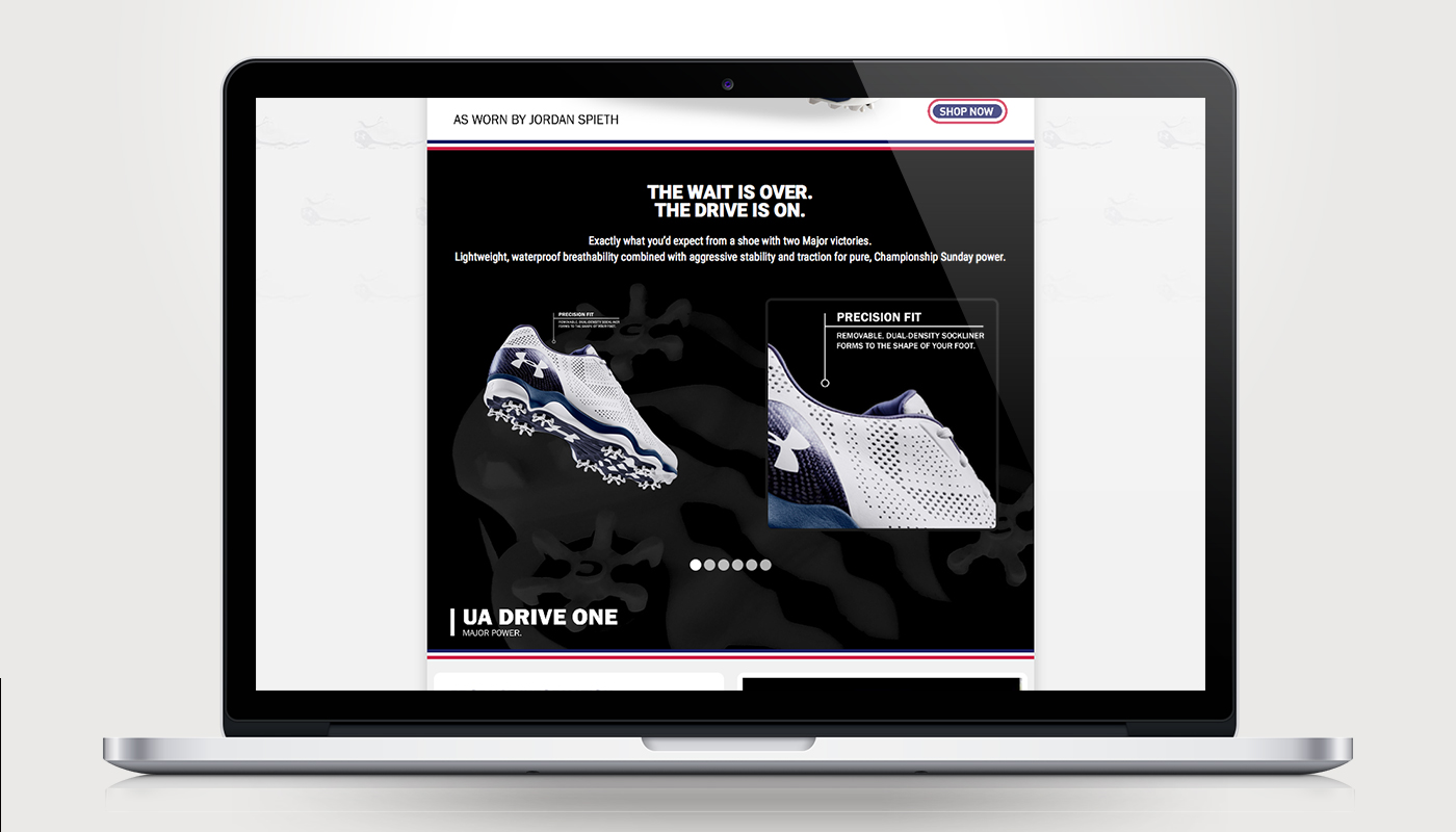 Under Armour was asking for a product landing page on the American Golf website for their ‘Drive One’ shoe launch in May 2016. The golf shoe, worn by Jordan Spieth, and it’s features should be presented to potential customers on this page in an engaging, yet informative way and by following the brand’s guidelines.
